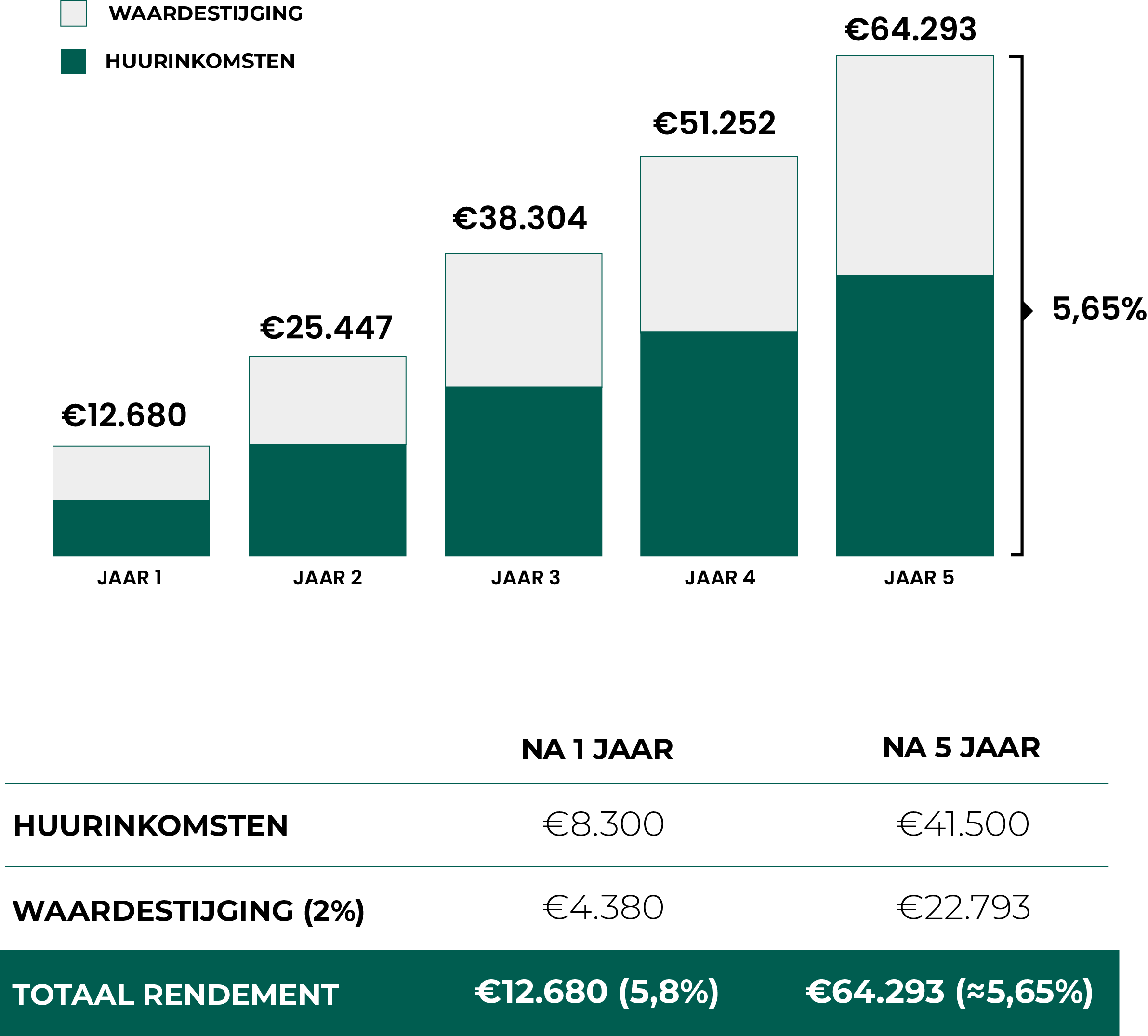 Zo kan jouw investering oplopen tot een totaalrendement van €64.293* (~5,65%)* na 5 jaar*